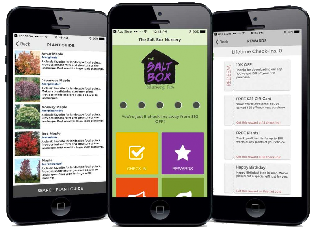 We’ve created a Salt Box Nursery mobile app. That’s right, now you can download our free app and keep up with everything here at Salt Box Nursery. What’s more you can earn great rewards just by checking in at the register with your daily purchases. It’s really simple to use, just check in and we’ll ‘punch’ your digital punch card. Fill up your punch card and you’ll earn great rewards. In addition we’ve added a plant guide with pictures and care and culture information.
