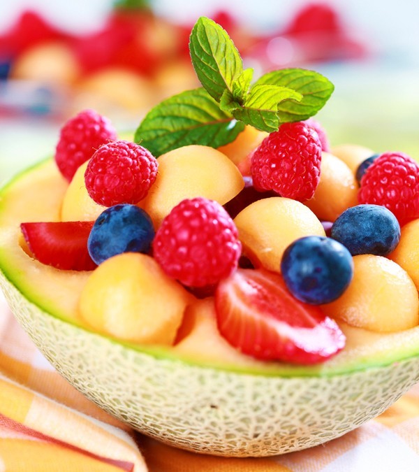 Scoop out cantaloupe with melon baller and place balls in a bowl. You should have about 2 cups. Pour any cantaloupe juice in to the bowl. Peel kiwi, cut crosswise into thin slices, then quarter the slices. Add to bowl. Hull and slice enough strawberries lengthwise to make 1 cup and place in the bowl. Add raspberries/blackberries. Sprinkle fruit with chopped mint leaves and drizzle with orange juice. Toss gently.